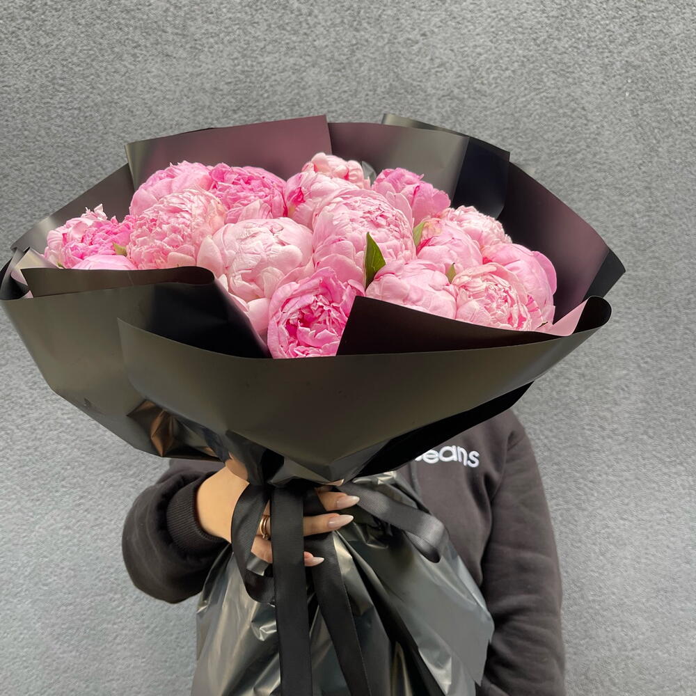 Голландська півонія сорту Sarah Bernhardt в чорному стильному пакуванні.