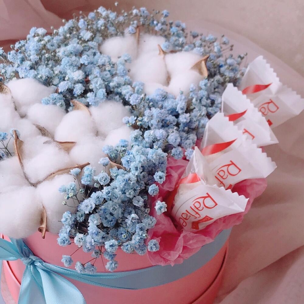 Хлопок – 5 шт.Конфеты Raffaello – 4 шт.Шляпная коробка – 1 шт.Флористическая губка – 1 шт.инструкция по уходу за цветами – 1 шт.любовь флориста – 1 шт.голубая гипсофила – 4 шт.