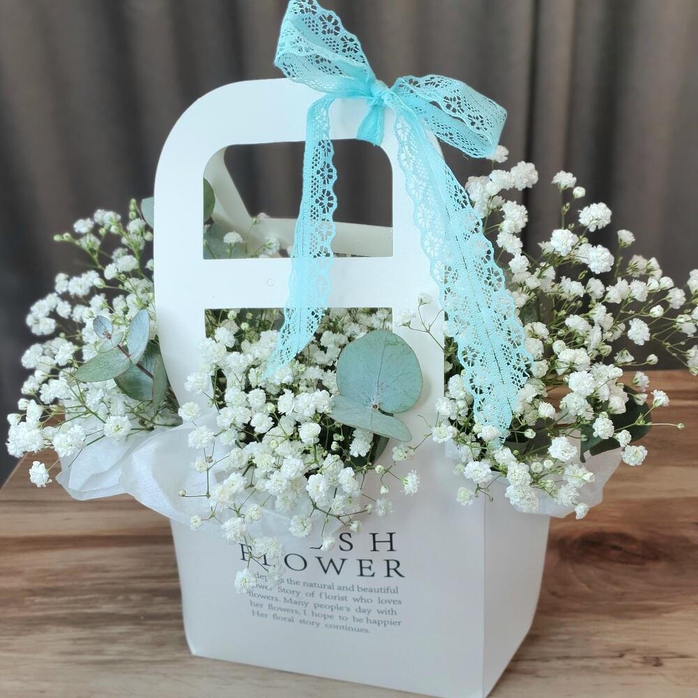 Лента Кружево – 1 шт.Эвкалипт пучок – 1 шт.Оазис флористический – 1 шт.сумочка декоративная – 1 шт.Гипсофила – 4 шт.