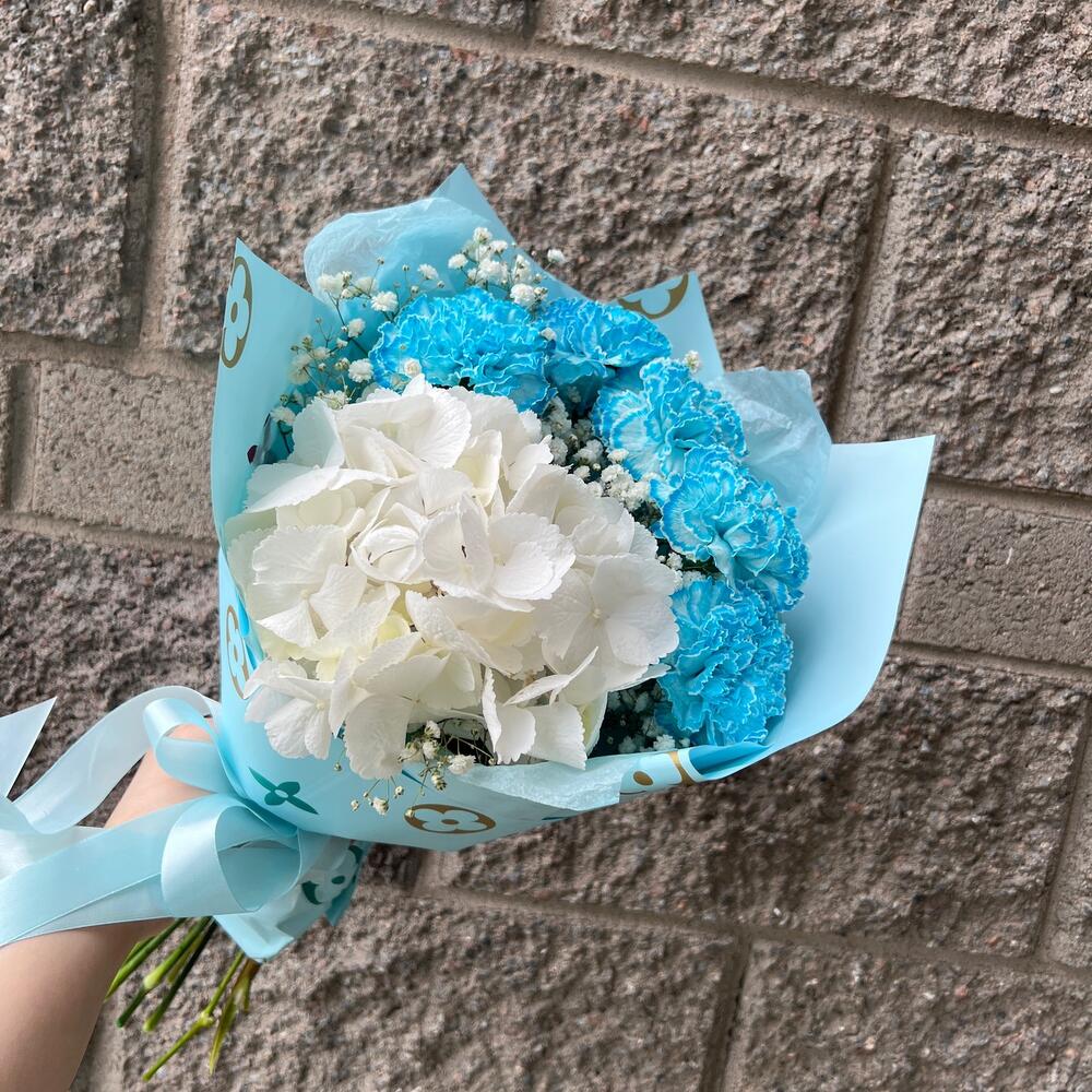 Гортензия – 1 шт.Диантус – 5 шт.Гипсофила – 2 шт.Упаковка дизайнерская – 4 шт.Лента атласная – 2 шт.