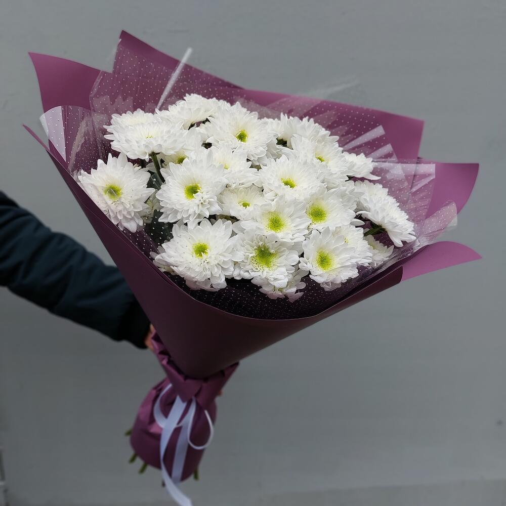 Хризантема кустовая белая – 7 шт.Упаковка дизайнерская – 2 шт.Лента атласная – 1 шт.
