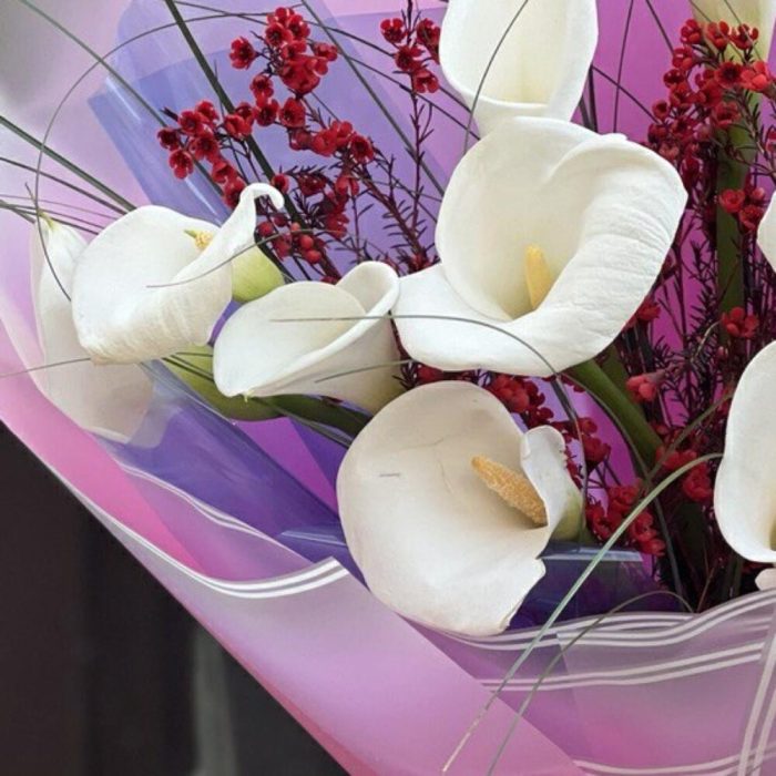 Калла – 11 шт. Хамелациум – 3 шт. Берграсс – 1 шт. Упаковка дизайнерская – 8 шт. Лента – 1 шт.