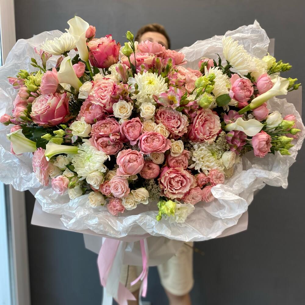 Альстромерия – 7 шт.Эустома – 10 шт.Лента атласная – 2 шт.Упаковка дизайнерская – 10 шт.зелень пучок – 5 шт.магнум белый – 7 шт.розы – 7 шт.розы кустовые – 21 шт.каллы – 7 шт.
