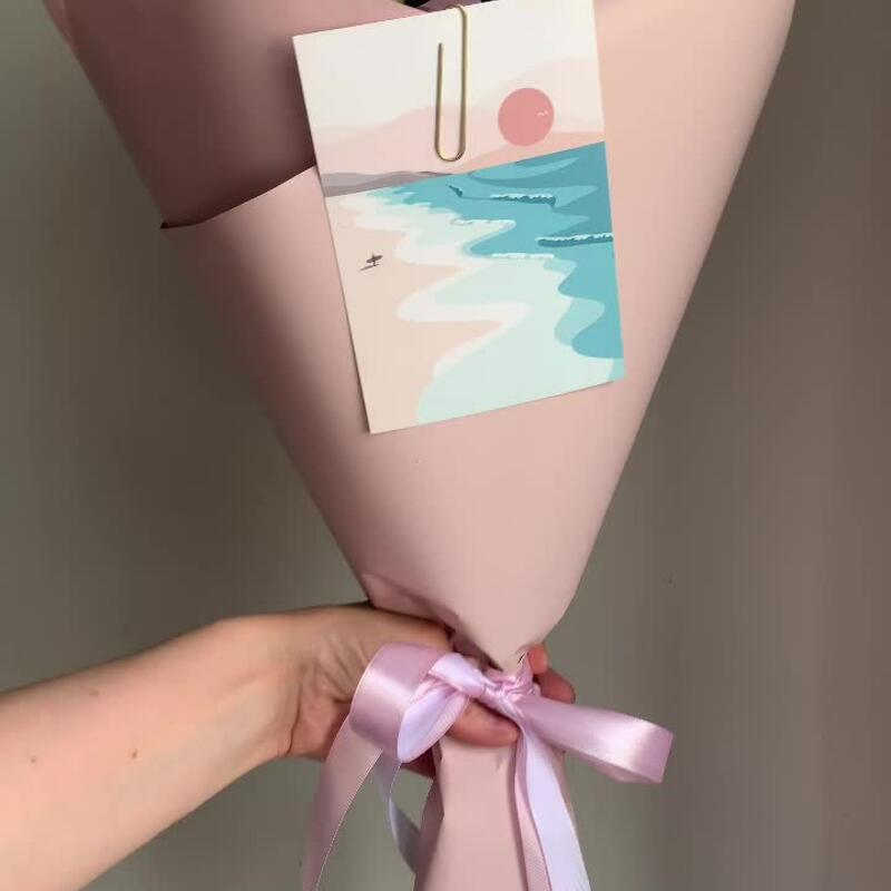 Пион – 5 шт.Зелень – 3 шт.Лента атласная – 2 шт.Упаковка дизайнерская – 3 шт.