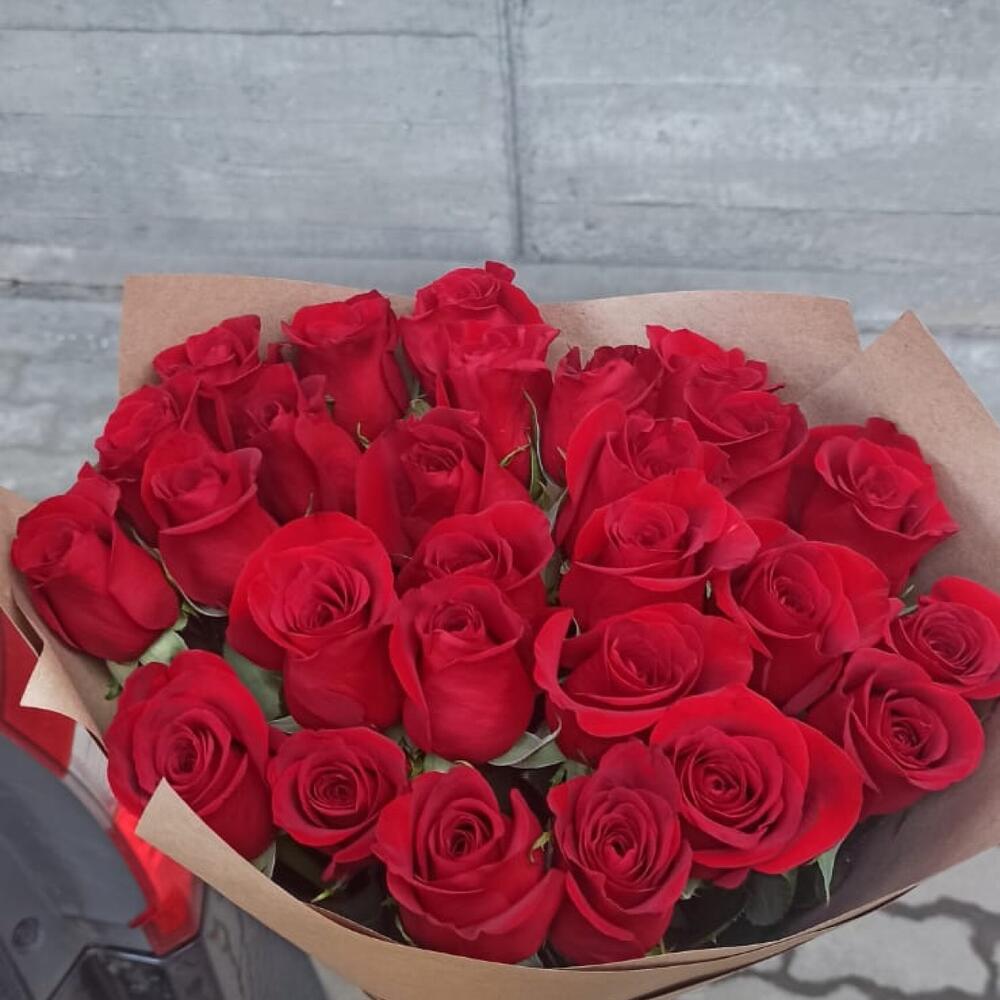 розы эквадор 70 см – 27 шт.Крафт дизайнерский – 2 шт.Лента атласная – 1 шт.