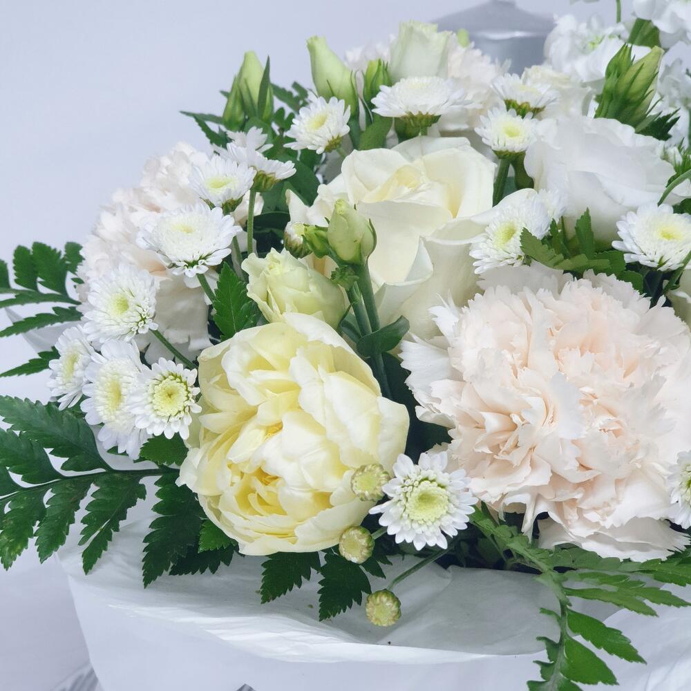 роза белая крупная – 2 шт.Маттиола белая – 1 шт.эустома белая – 1 шт.гвоздика белая сортовая – 3 шт.тюльпаны белые – 3 шт.папоротник ветка – 2 шт.сантини хризантема кустовая – 1 шт.Коробка шляпная с принтом – 1 шт.Лента атласная – 2 шт.Оазис флористический – 1 шт.Открыточка с вашими пожеланиями – 1 шт.