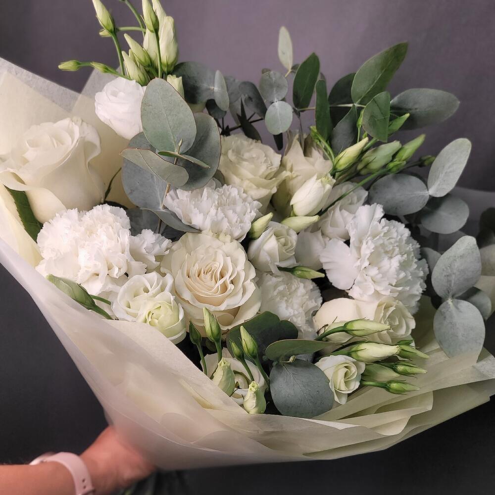 Роза Эквадор белая – 5 шт.Лизиантус – 3 шт.Диантус – 5 шт.Эвкалипт – 2 шт.Упаковка дизайнерская – 2 шт.