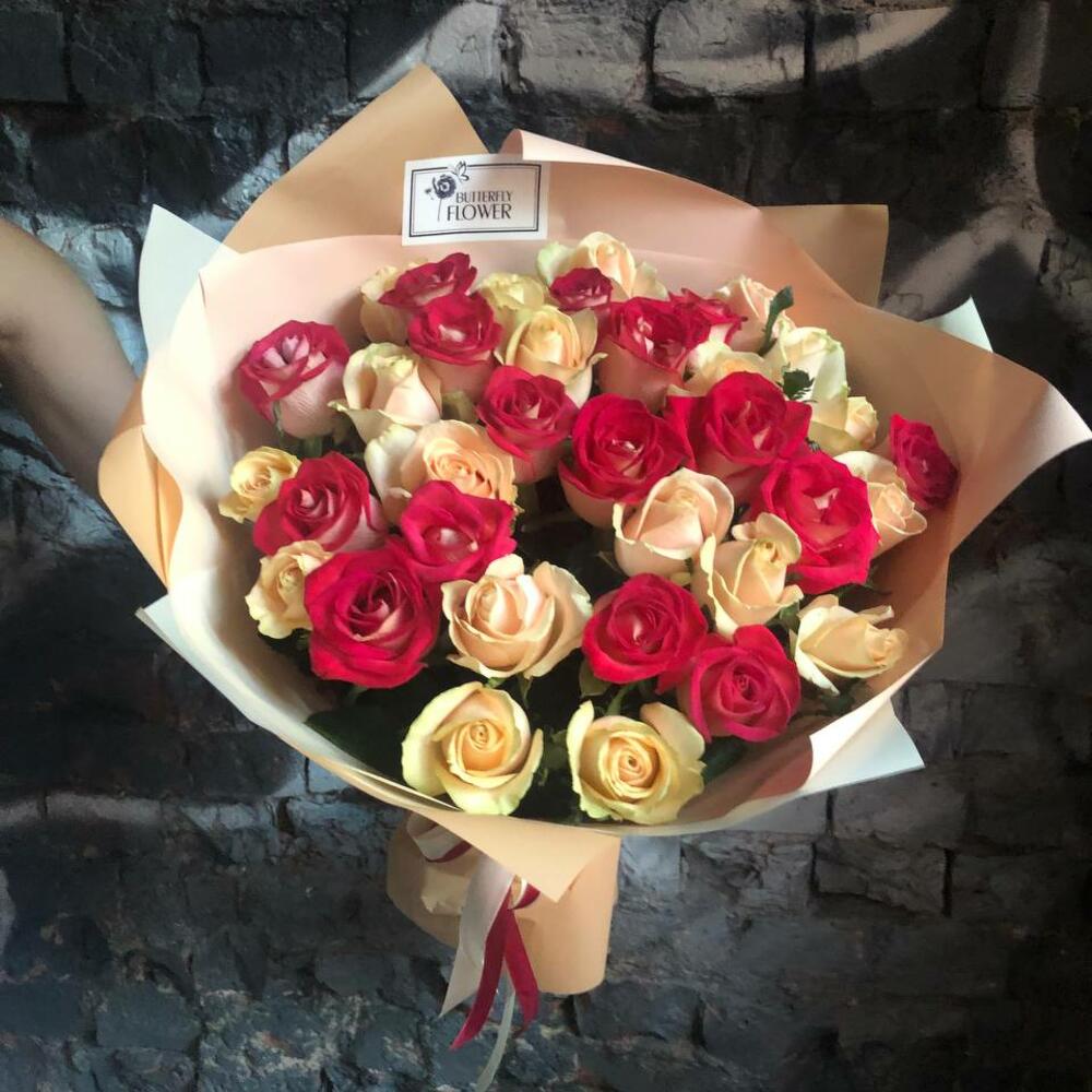 Букет из 35 красных и кремовых роз в стильной упаковке “Красно-кремовое боке”