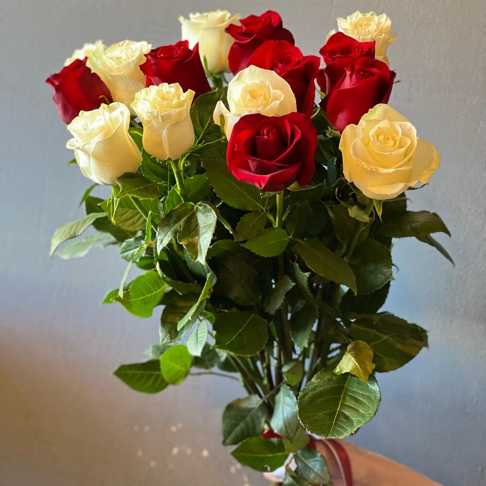 розы микс – 15 шт.Лента атласная – 2 шт.работа флориста – 1 шт.