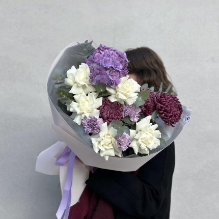 Гортензия – 1 шт. Роза – 6 шт. георгины – 1 шт. Илекс – 1 шт. Гвоздика – 1 шт. Эвкалипт – 1 шт.