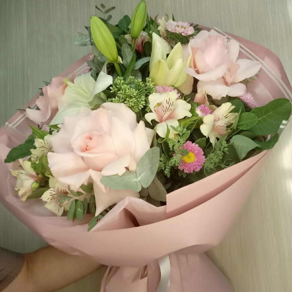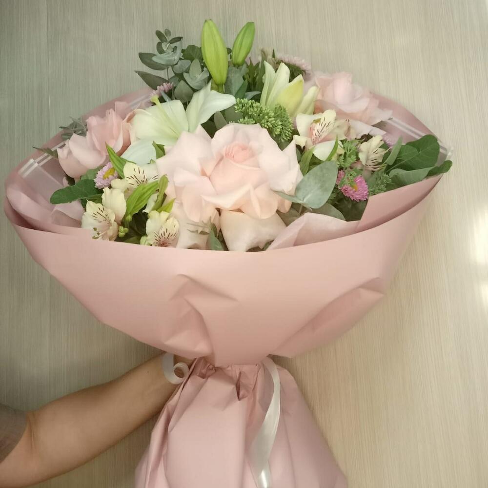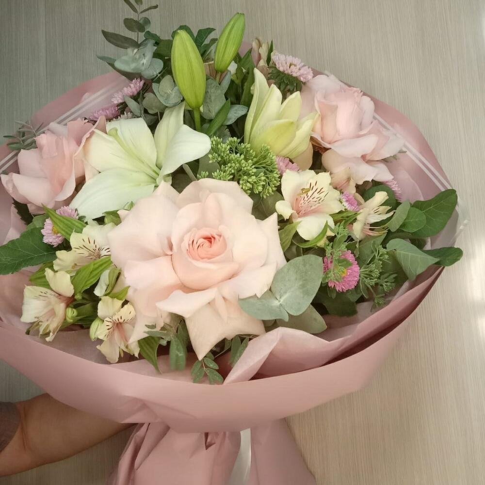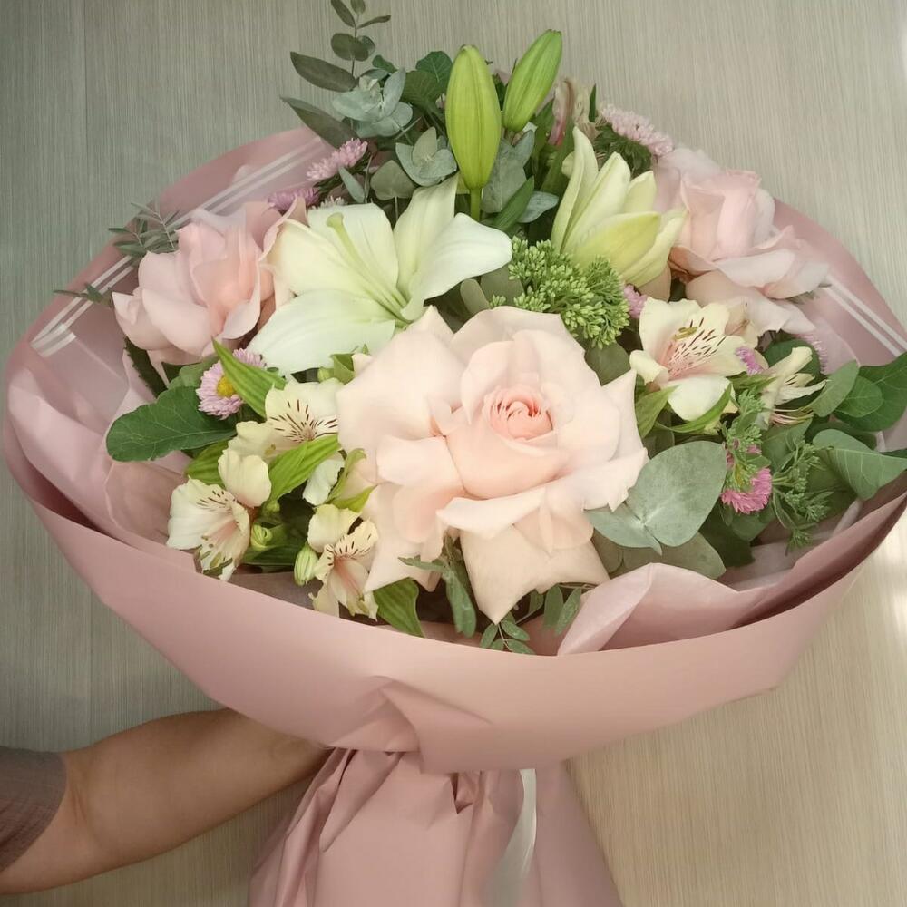 Категории: Альстромерии, Лилии, Розы, Эвкалипт