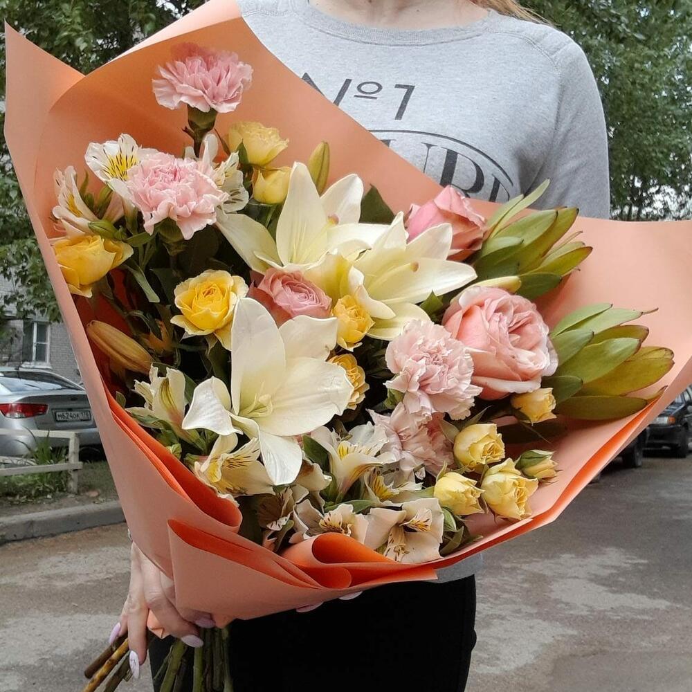 Категорий: Альстромерии, Гвоздики, Кустовые розы, Лилии, Пионовидные розы, Розы