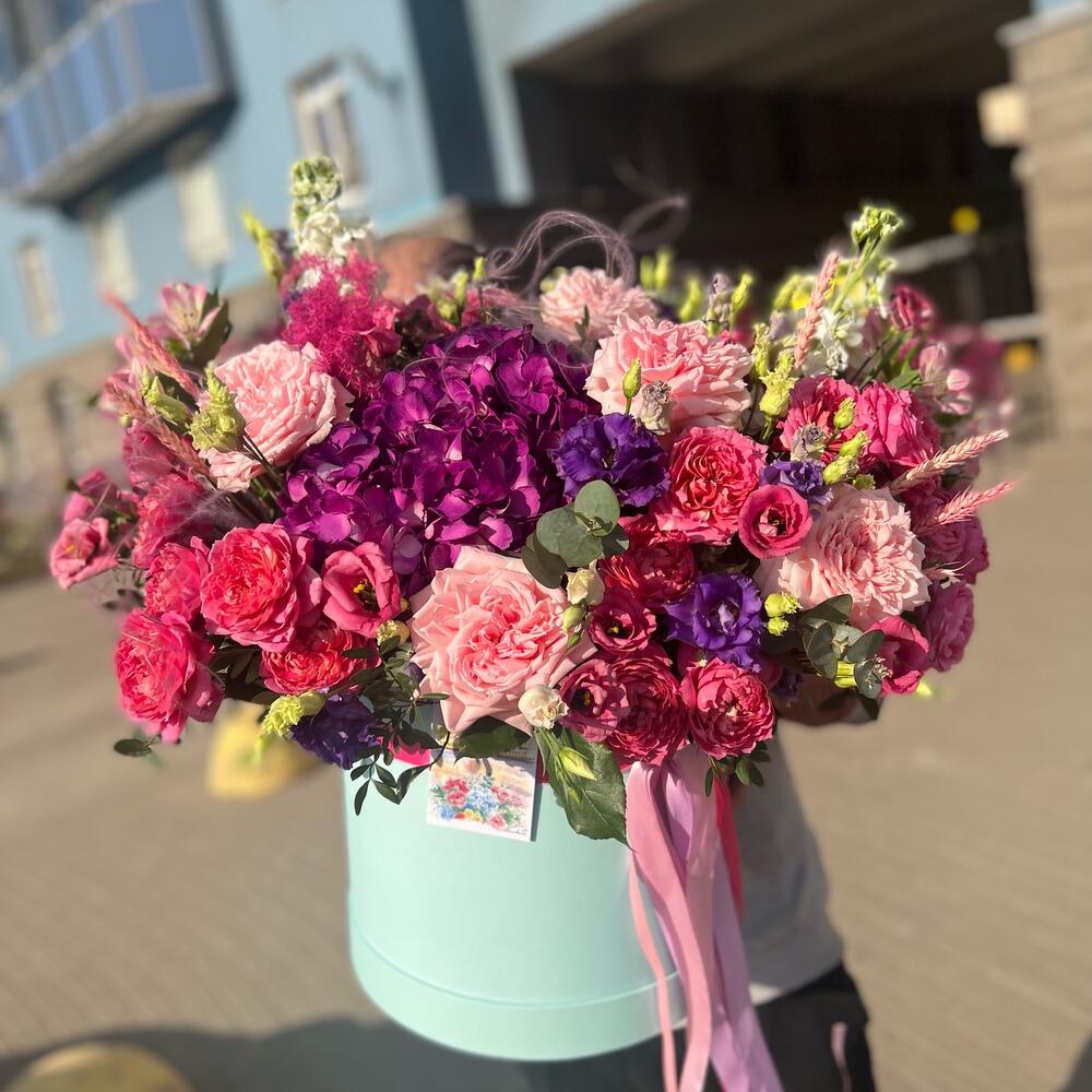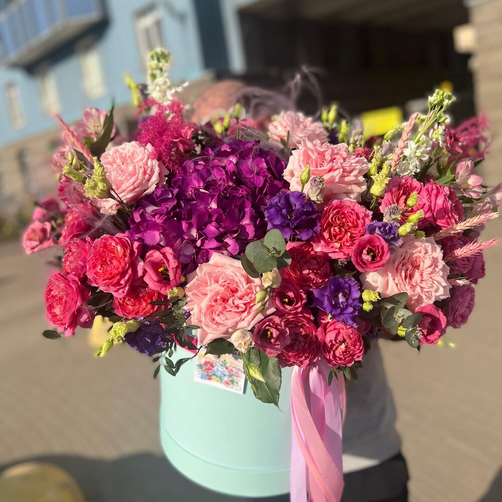 Цветы в коробке с гортензией,пион розами,маттиолой,альстромерией,эустомой,колосьями пшеницы и эвкалиптом