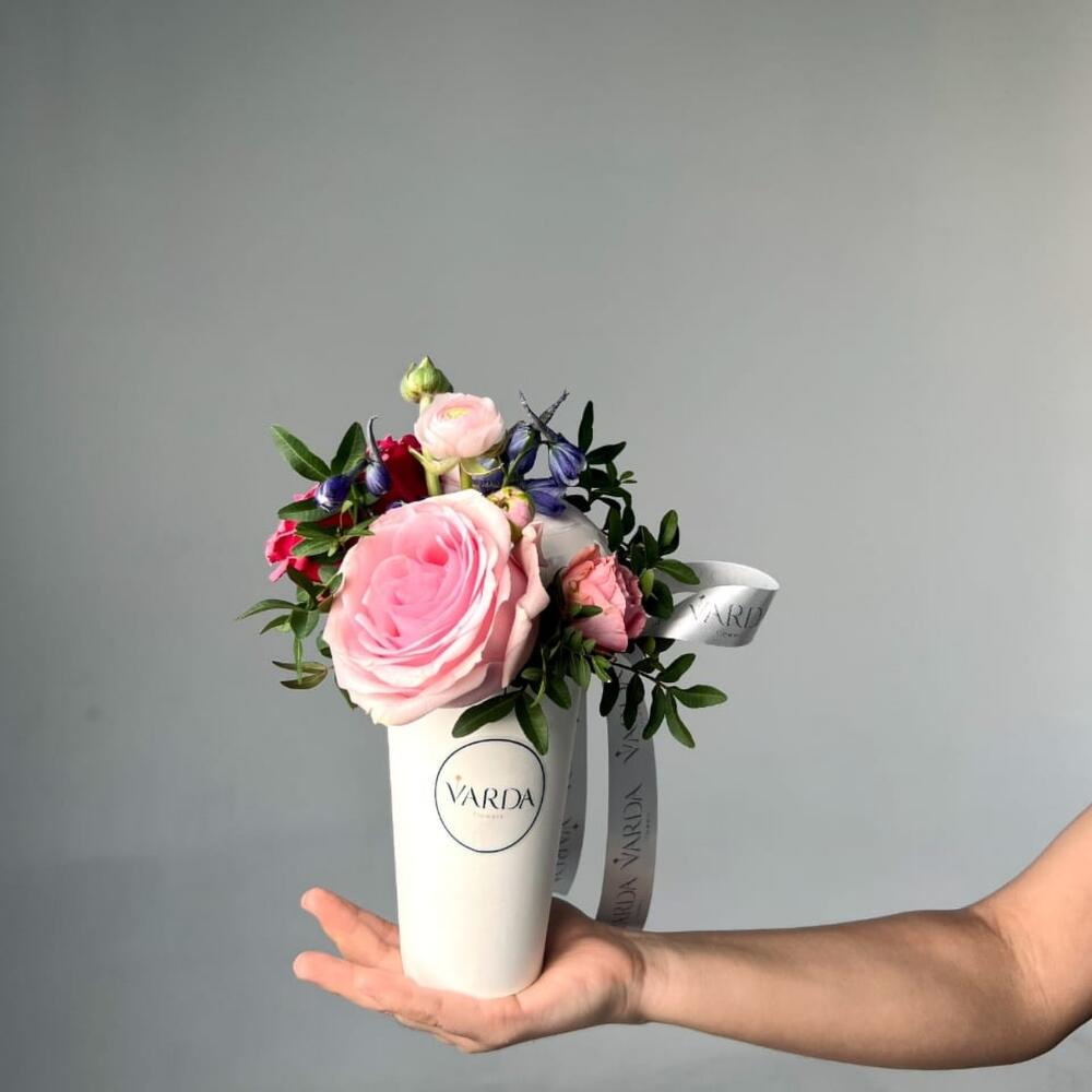Роза – 3 шт. Кустовая роза – 1 шт. Оазис – 1 шт. Фисташка – 1 шт. стакан кофейный – 1 шт.