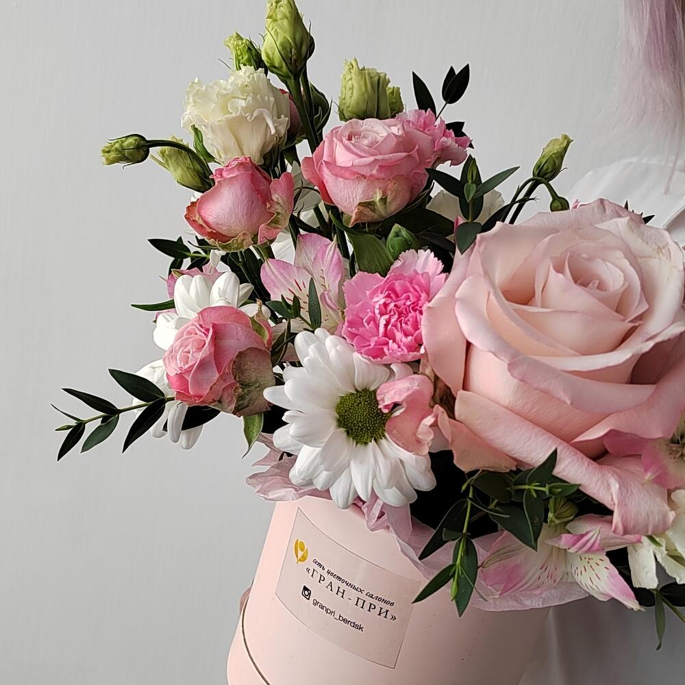 Роза кустовая – 1 шт.Хризантема кустовая – 1 шт.Роза – 1 шт.Эустома – 2 шт.Коробка шляпная – 1 шт.Гвоздика кустовая – 3 шт.Эвкалипт первифолиа – 3 шт.