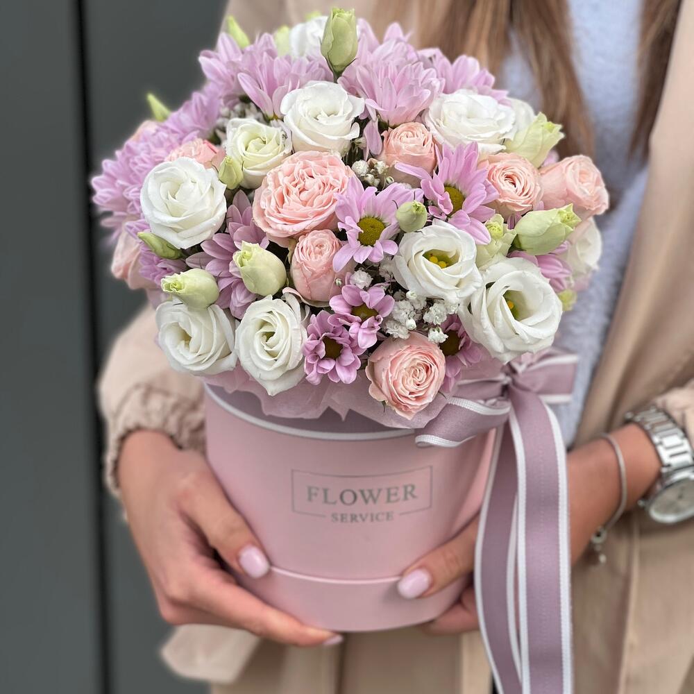 Коробка цветов из хризантемы, кустовой розы, эустомы и зелени!