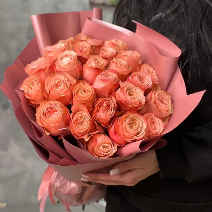 Пионовидная роза кахала – 25 шт.Упаковка дизайнерская – 5 шт.Лента атласная – 2 шт.