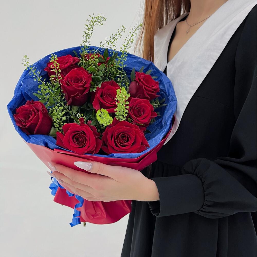 Роза красная премиум – 9 шт.Гринбелл – 5 шт.Фисташка пучок – 1 шт.Тишью – 1 шт.Упаковка матовая – 1 шт.Лента – 1 шт.