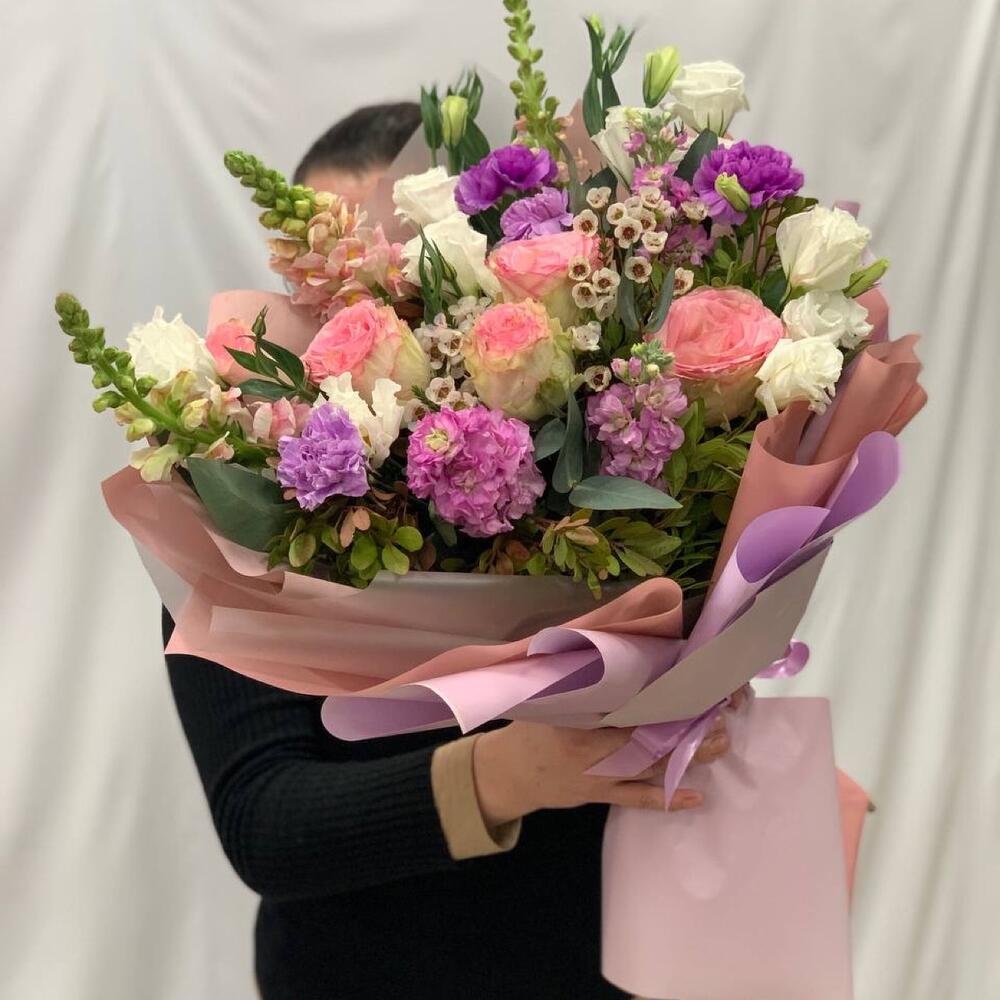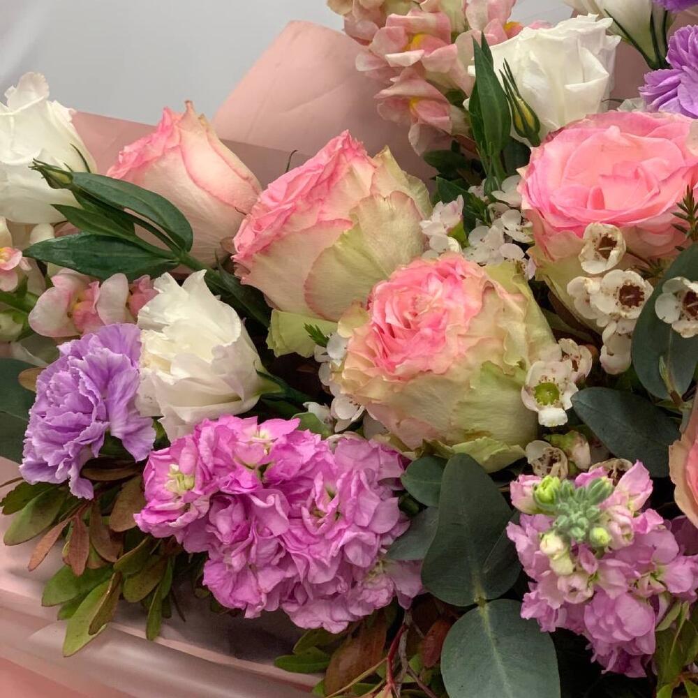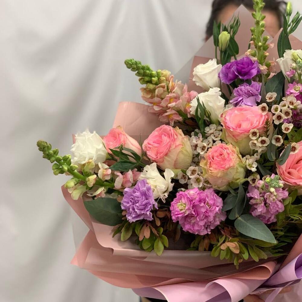 антиринум – 3 шт.Диантус – 4 шт.Роза Эквадор – 5 шт.Лизиантус – 3 шт.Фисташка – 6 шт.Эвкалипт – 6 шт.Ваксфлауэр – 2 шт.Маттиола – 3 шт.Упаковка дизайнерская – 2 шт.
