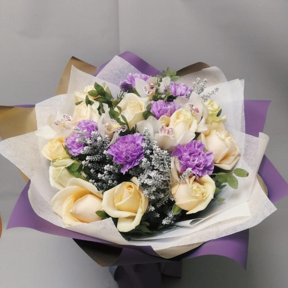 Роза кремовая – 11 шт.Гвоздика сиреневая – 6 шт.декор ветки – 3 шт.Черничник – 3 шт.Пленка дизайнерская – 3 шт.Лента атласная – 1 шт.