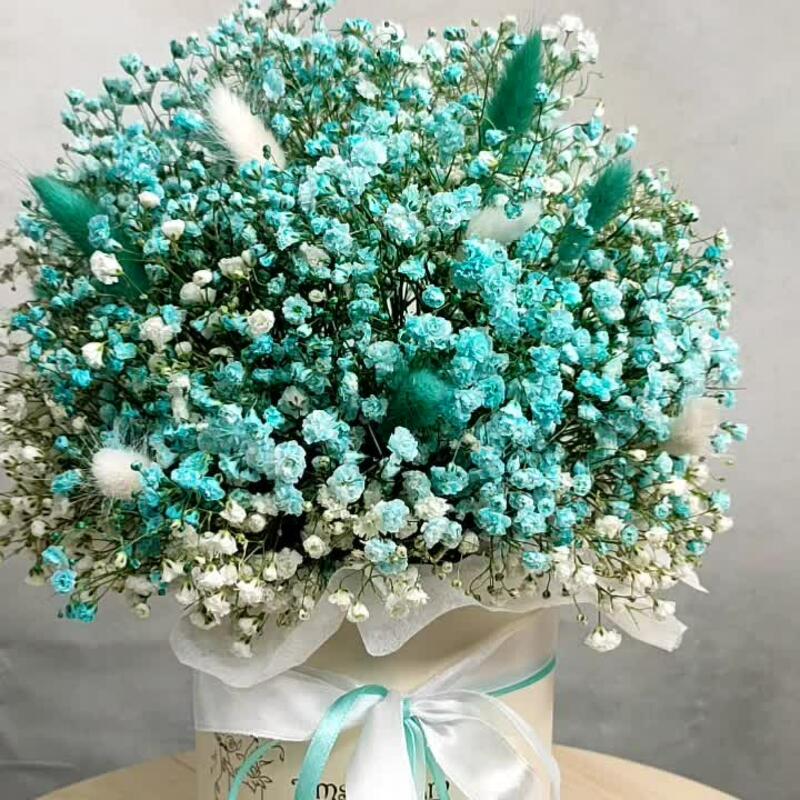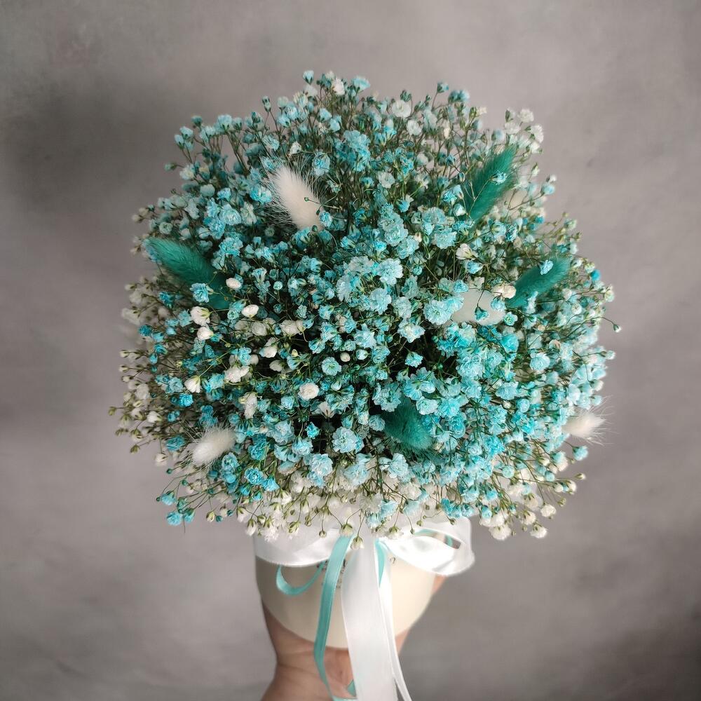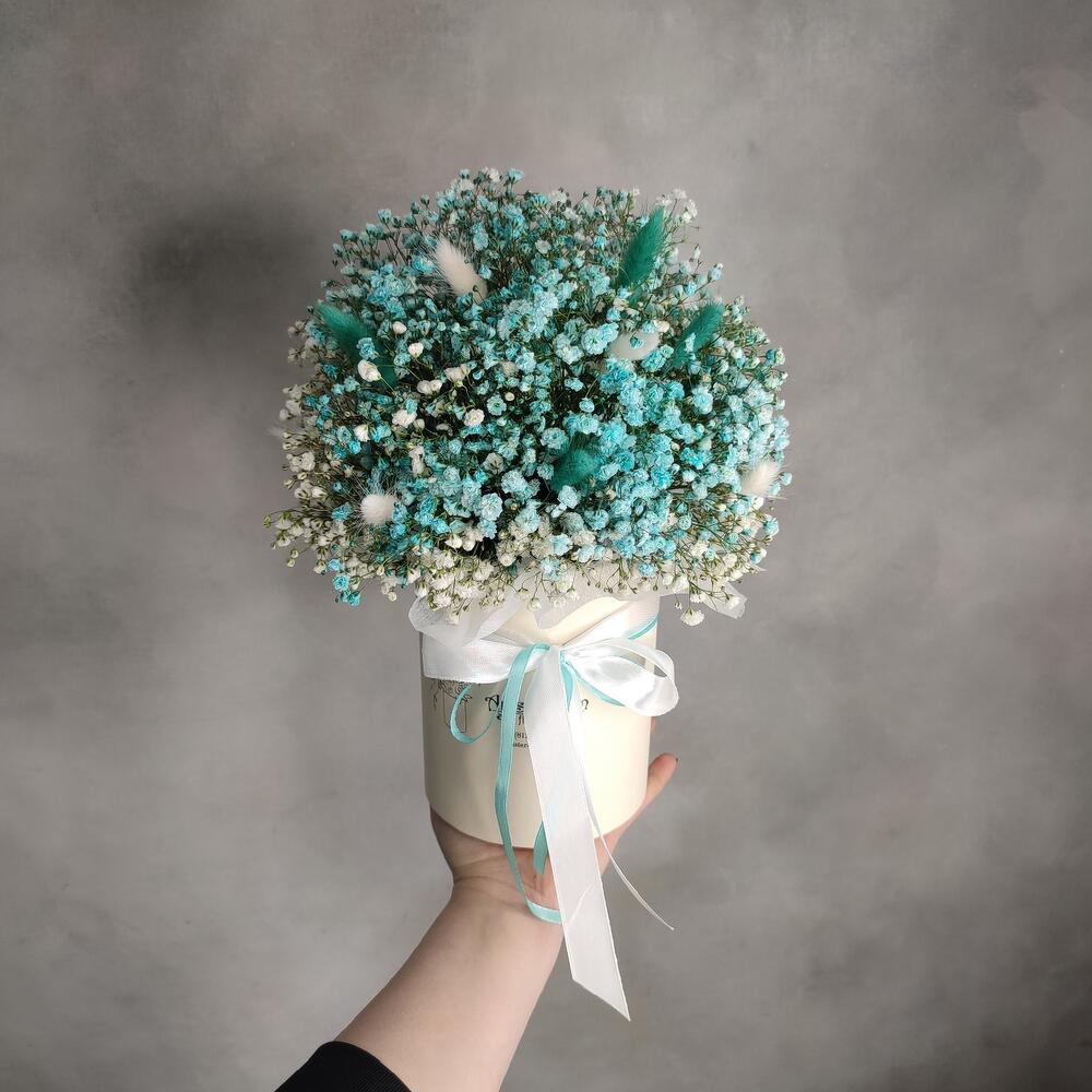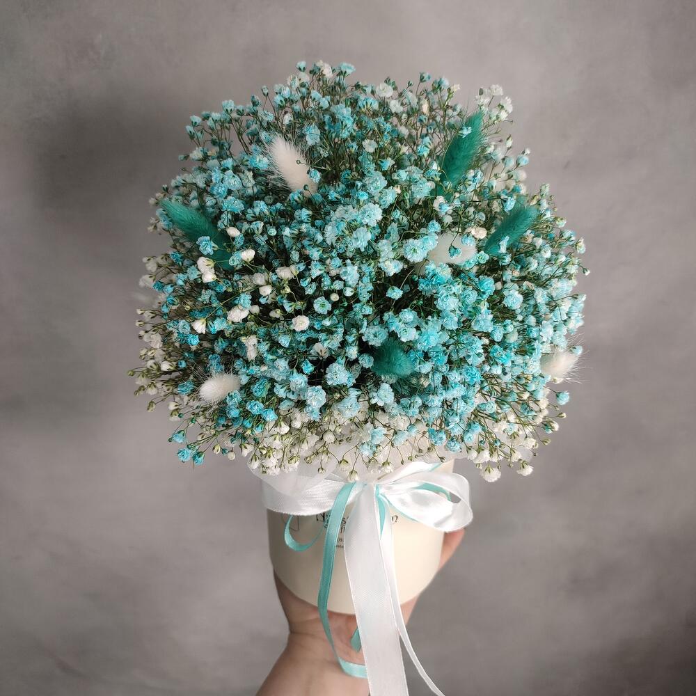 Коробка – 1 шт.Оазис флористический – 1 шт.Гипсофила – 7 шт.Лагурус белый – 8 шт.лагурус бирюзовый – 7 шт.