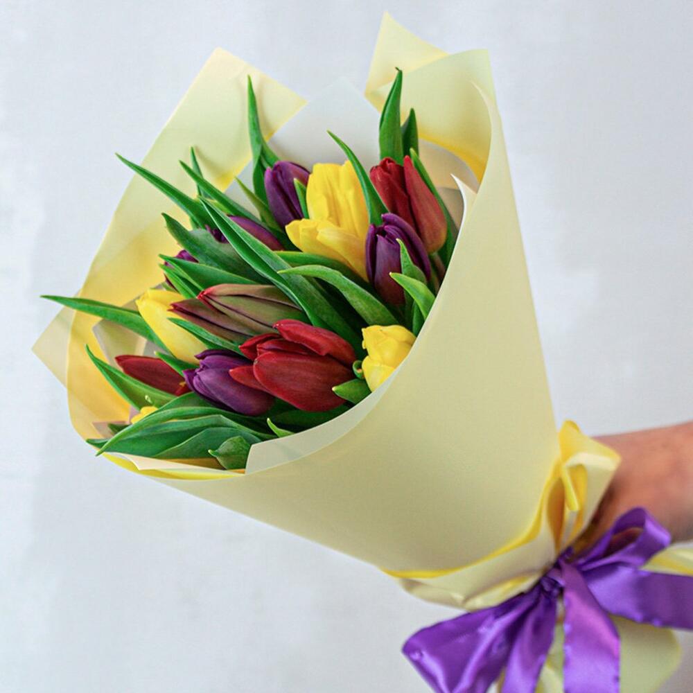 Букет из 15 тюльпанов стандарт яркий микс в упаковке