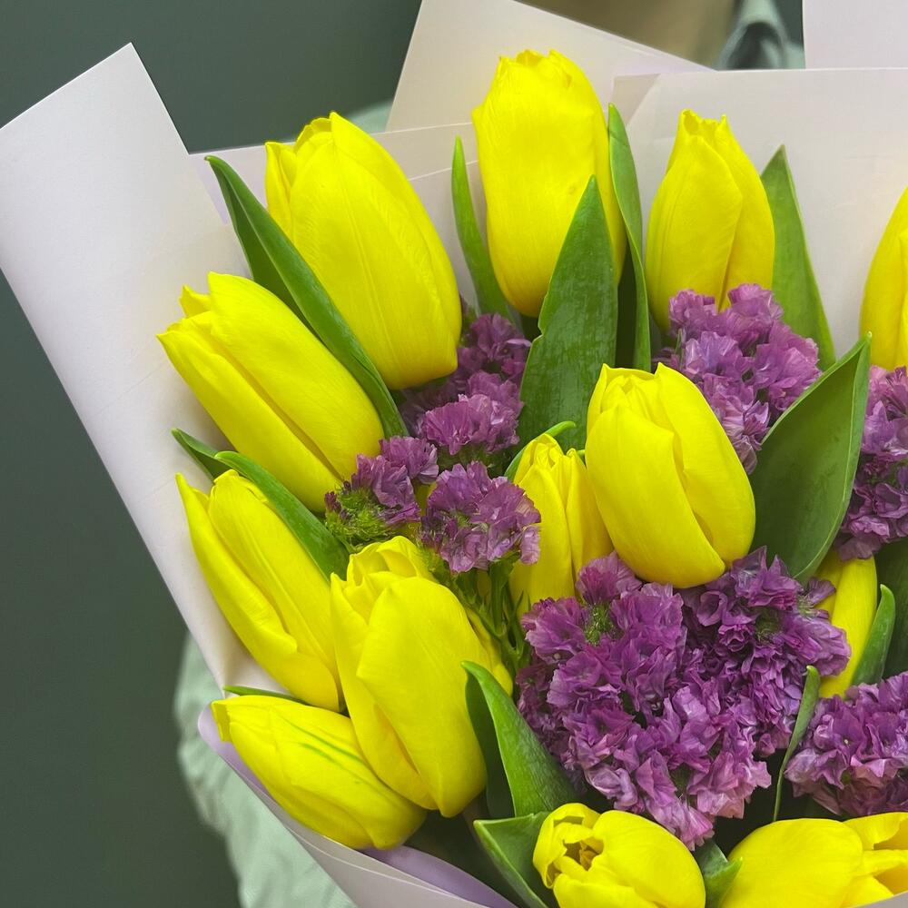 Тюльпан желтый – 15 шт.статица ярко-розовая – 1 шт.Упаковка корейская пленка – 1 шт.Лента атласная – 1 шт.